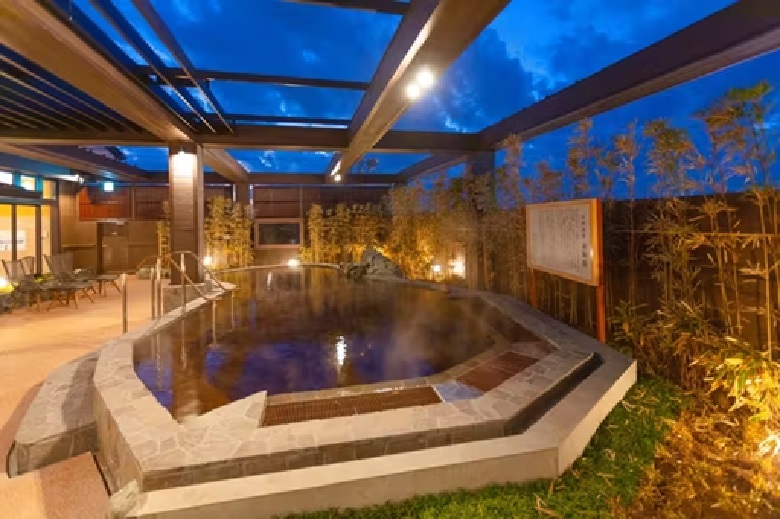 お風呂は真っ黒な天然温泉で、肌にやさしい弱酸性の泉質。黒湯の露天風呂は、空とのコントラストも美しく、癒し効果抜群。炭酸泉や替わり湯なども揃っており、バリエーション豊かに楽しめます。サウナ好きも温泉好きも満足できる充実の施設です。