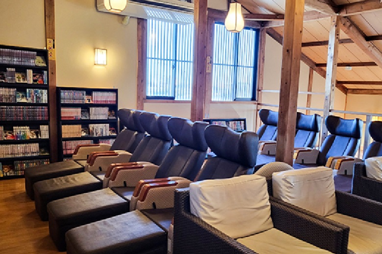お風呂上りに漫画を読みながらドリンクをいただけるカフェコーナー、リクライニングチェアが並ぶお休みどころなどもあり。読む・くつろぐ・眠る、全部ここで叶っちゃいます。