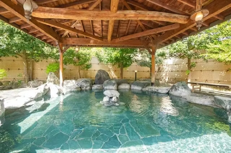 地下1,600mから湧き出る天然温泉「太鼓の湯」は源泉かけ流しで、芯から温まり肌もすべすべに。7種類の露天風呂や夜のライトアップもあり、開放的な空間の中で温泉巡りを楽しめます。