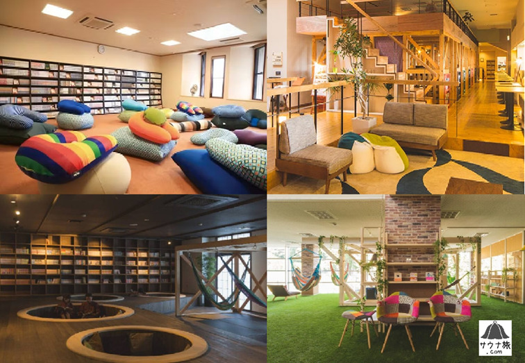 15,000冊以上の漫画・雑誌が揃い、リクライニングチェアやハンモックでゆったり読書も可能。巣ごもりテラスや無料ドリンクも完備され、カップルや家族で1日中リラックスして過ごせる癒しの空間です。