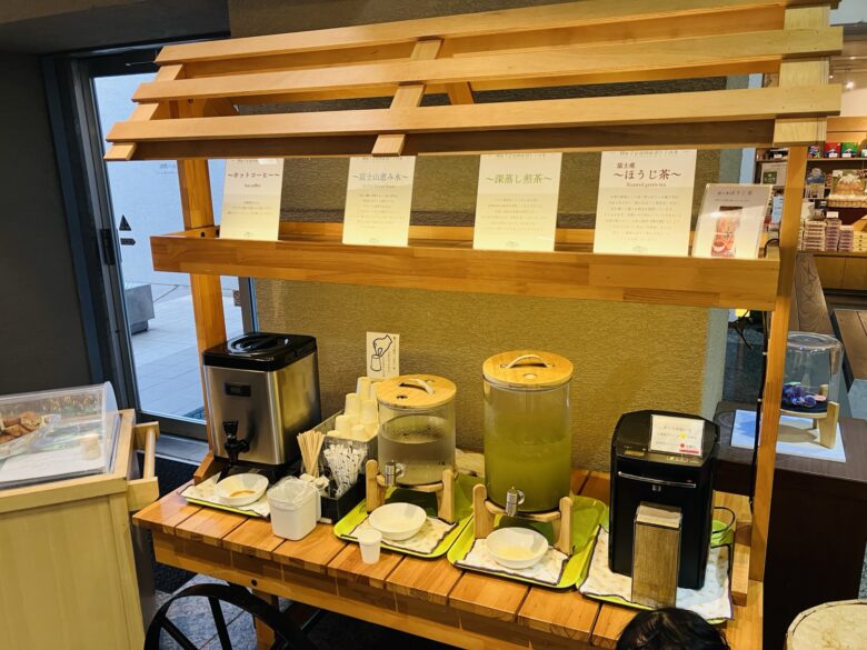 ウェルカムドリンクは、冷たい静岡茶とあたたかいほうじ茶、富士山恵み水とコーヒー。富士宮市は「水道水のおいしい都市32選」に選ばれていることもあり、水がとてもおいしい。