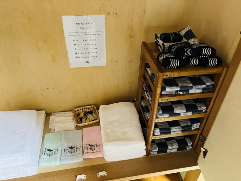タオルや浴衣は棚の中にあり。大浴場用のカゴも人数分用意されているのが便利でした。