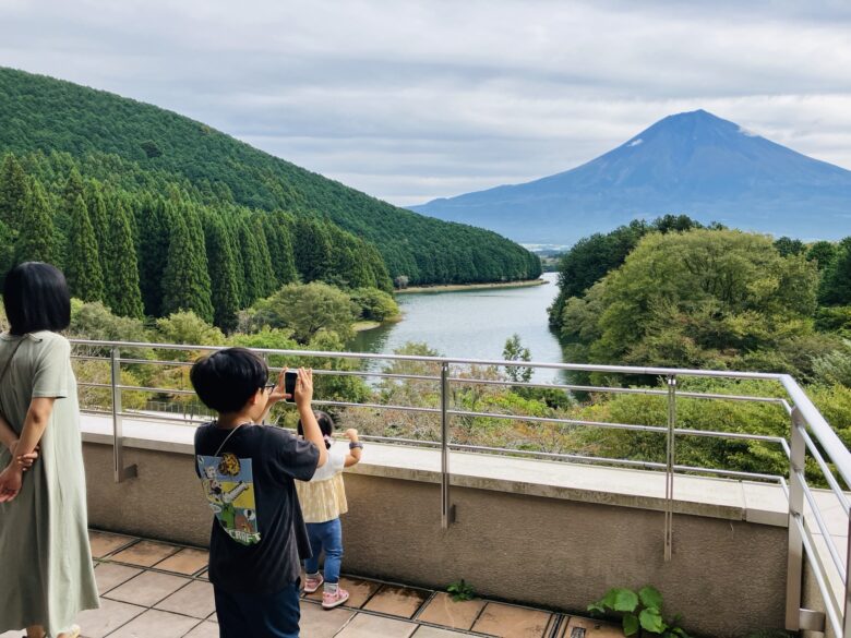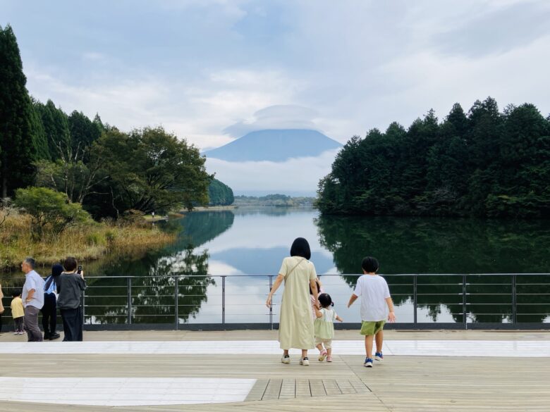 田貫湖ごしの富士山をバックに写真が撮れる人気フォトスポット。我が家も撮影タイム。