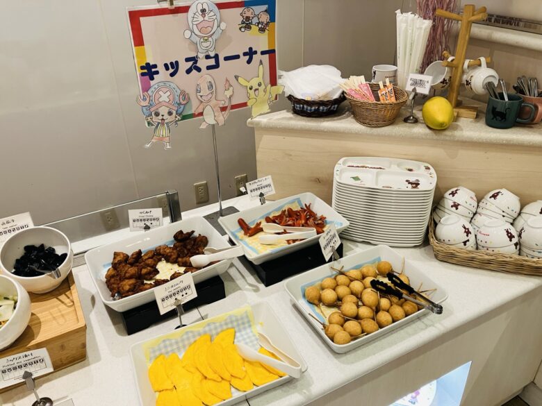 3歳以下の子どもは無料ですが、食事(バイキング)は一緒に食べられます。ただし、お布団やアメニティー類はつかないので、必要な際は別途料金(当時550円)が必要なため、ホテルへご相談ください。