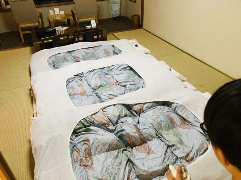 夕食後にはお布団を敷いてくれますので、家族みんなで川の字で寝ます。