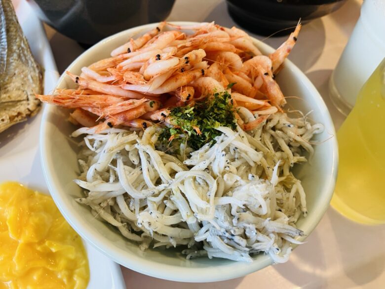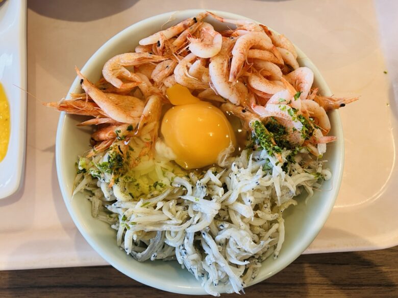 注目は「駿河湾のしらす&桜えび丼」。釜揚げにしたふんわりしらすと、ぷりっと甘みのある桜えびを白ごはんにのせて、特製だし醤油でいただく贅沢な朝のごちそう。シンプルなのに、ちゃんと地元感があって大満足!