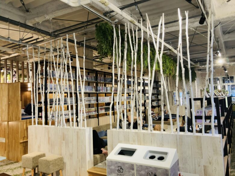 8,500冊以上のコミックが読み放題の休憩エリアには、カウチソファや半個室BOX、リクライニングなど多彩な席が用意されています。